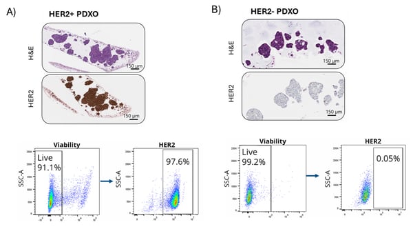 Figure 3. HER2 expression assessed by IHC and flow cytometry analysis. A) HER2-positive PDXO and B) HER2-negative PDXO model.