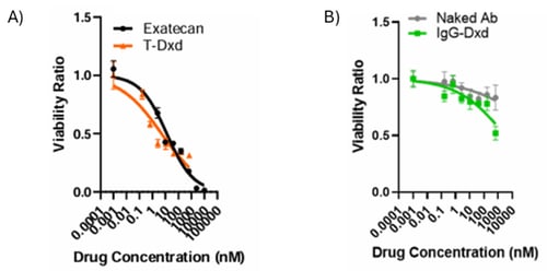 Figure 4. Representative dose-response curves (IC₅₀). A) HER2-positive PDXO model comparing exatecan (payload) and trastuzumab deruxtecan (T-DXd) and B) control naked antibody trastuzumab and isotype-payload conjugate IgG-DXd.