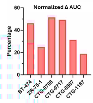 To further quantify differential treatment responses, normalized Area Under the Curve (∆AUC) values were calculated to capture response differences between isotype controls and ADCs across the full concentration range. HER2-positive breast cancer cell lines and PDXO models exhibited higher ∆AUC values (approximately 30–50%, data not shown), indicating stronger ADC activity relative to controls. In contrast, HER2-negative models showed substantially lower ∆AUC values (~20%), consistent with reduced ADC activity in the absence of target expression (Figure 5).