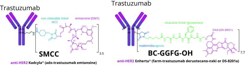 Figure 1. FDA approved HER2-targeted ADCs trastuzumab emtansine (T-DM1, Kadcyla®) and trastuzumab deruxtecan (T-DXd, Enhertu®). Figure adapted from Joubert et al1.