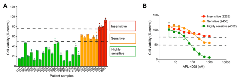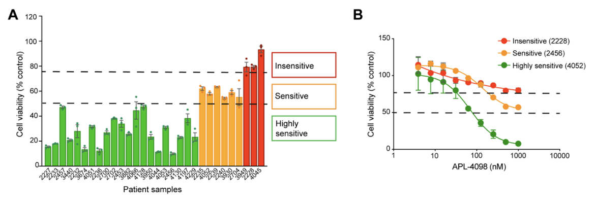 Figure 1. APL-4098 cytotoxic activity ex vivo. (A) Effect of 500 nM APL-4098 on the viability of patient-derived AML samples after 72h treatment. Values for each specimen are expressed relative to each sample’s matched vehicle-treated control (normalized to 100%) and presented as mean ± SEM, n=3. (B) Selected APL-4098 dose-response curves of highly sensitive (green), sensitive (orange), and insensitive (red) patient-derived samples.