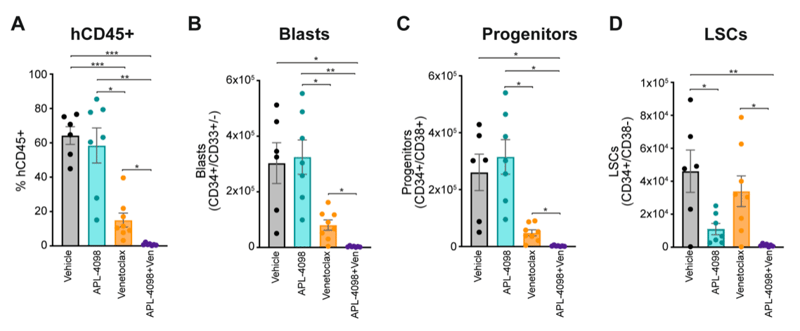 Figure 2. Effect of APL-4098, Venetoclax and the combination of both in vivo in an AML PDX model. Bone marrow from AML-engrafted animals was assessed for (A) the percentage of viable human CD45+. (B) the number of viable blasts (CD34+/CD33+/-). (C) the number of viable AML progenitors (CD34+/CD38+) (D) the number of viable LCSs (CD34+/CD38-). In all graphs, data shown as mean ± SEM, statistical significance determined by one-way ANOVA. *p<0.05, **p<0.01, ***p<0.001, ****p<0.0001. DMSO, n=6; APL-4098, n=7; Venetoclax, n=8, APL-4098 + Venetoclax, n=7.